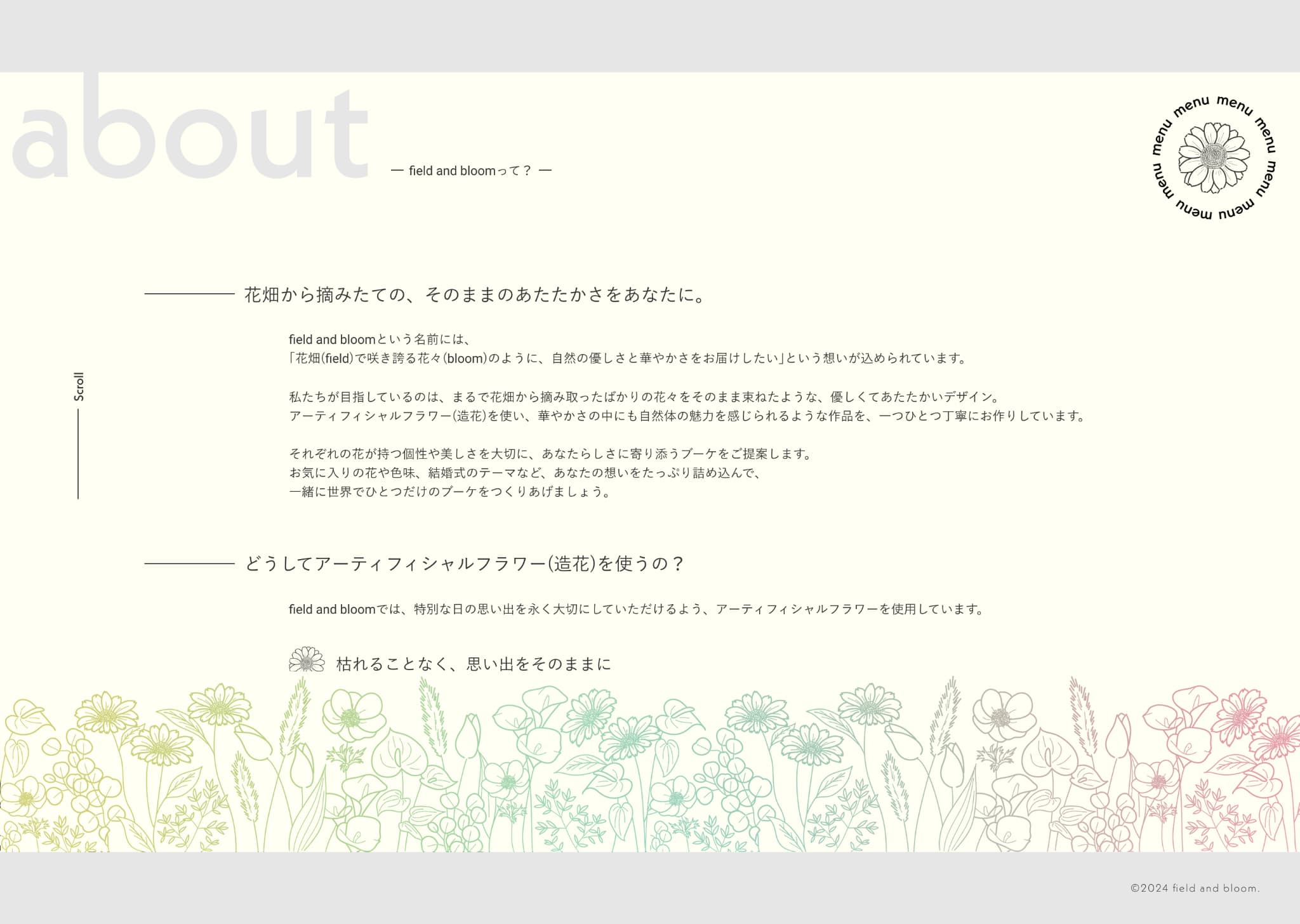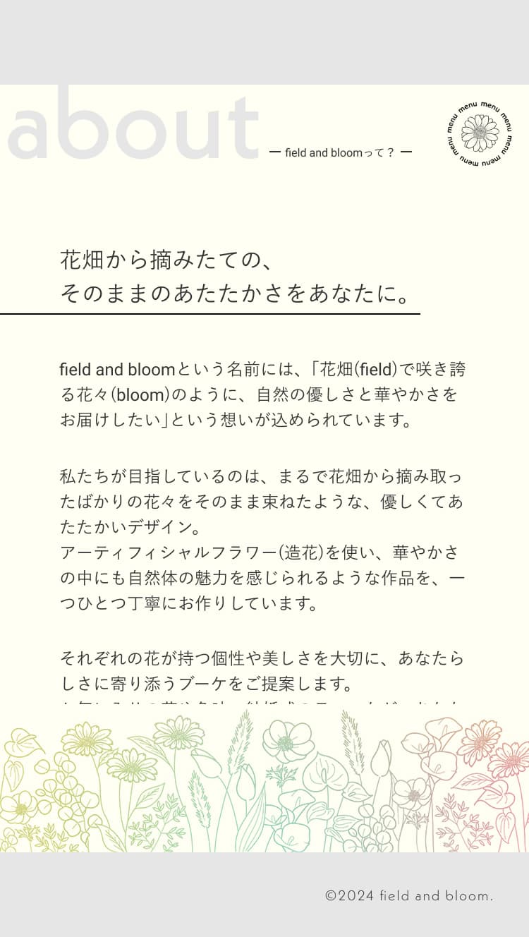 また、コンセプト・想いをまとめたaboutページを作ることで、作品だけではなくコンセプトや、造花を使う理由、ブーケに対する想いなどのクライアントの考えがしっかり伝わり、信頼感や安心感が得られるようにしました。