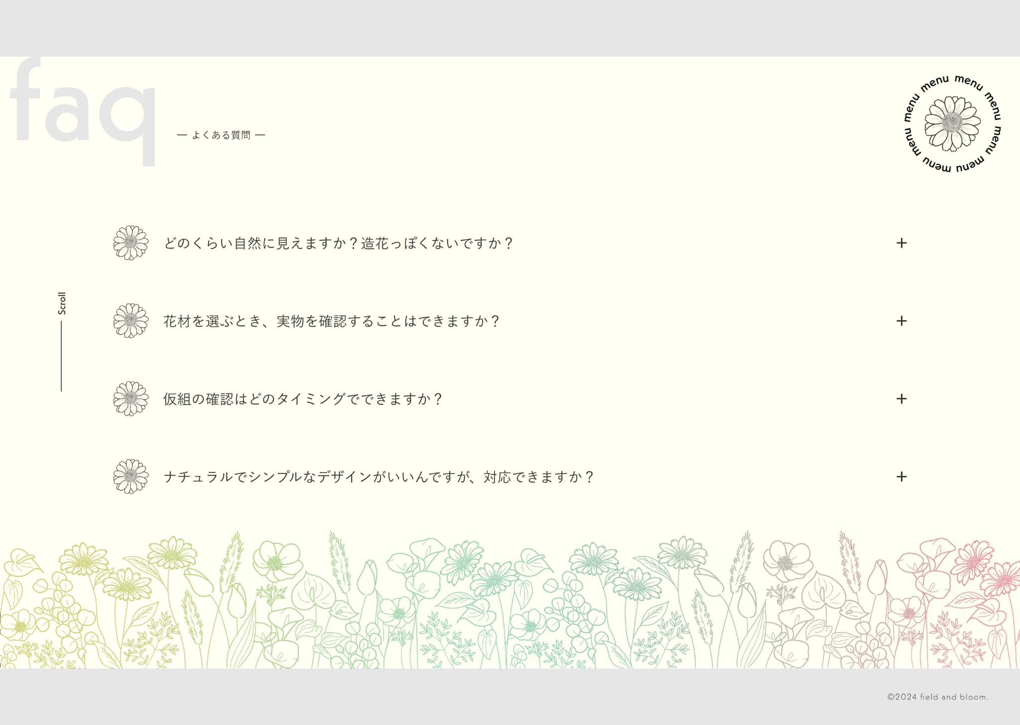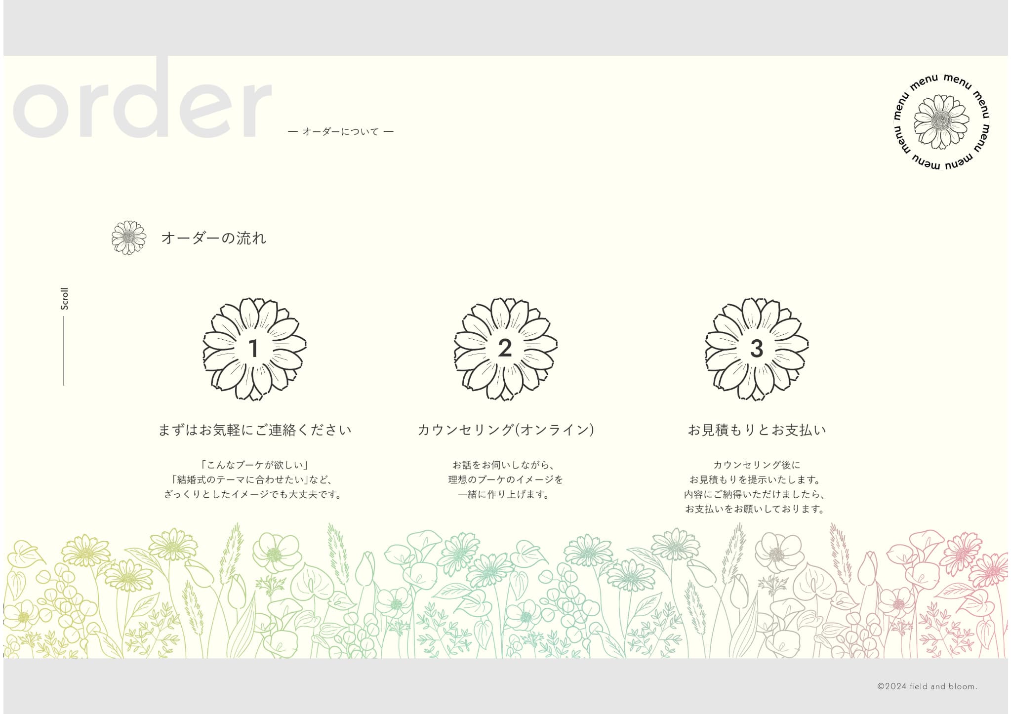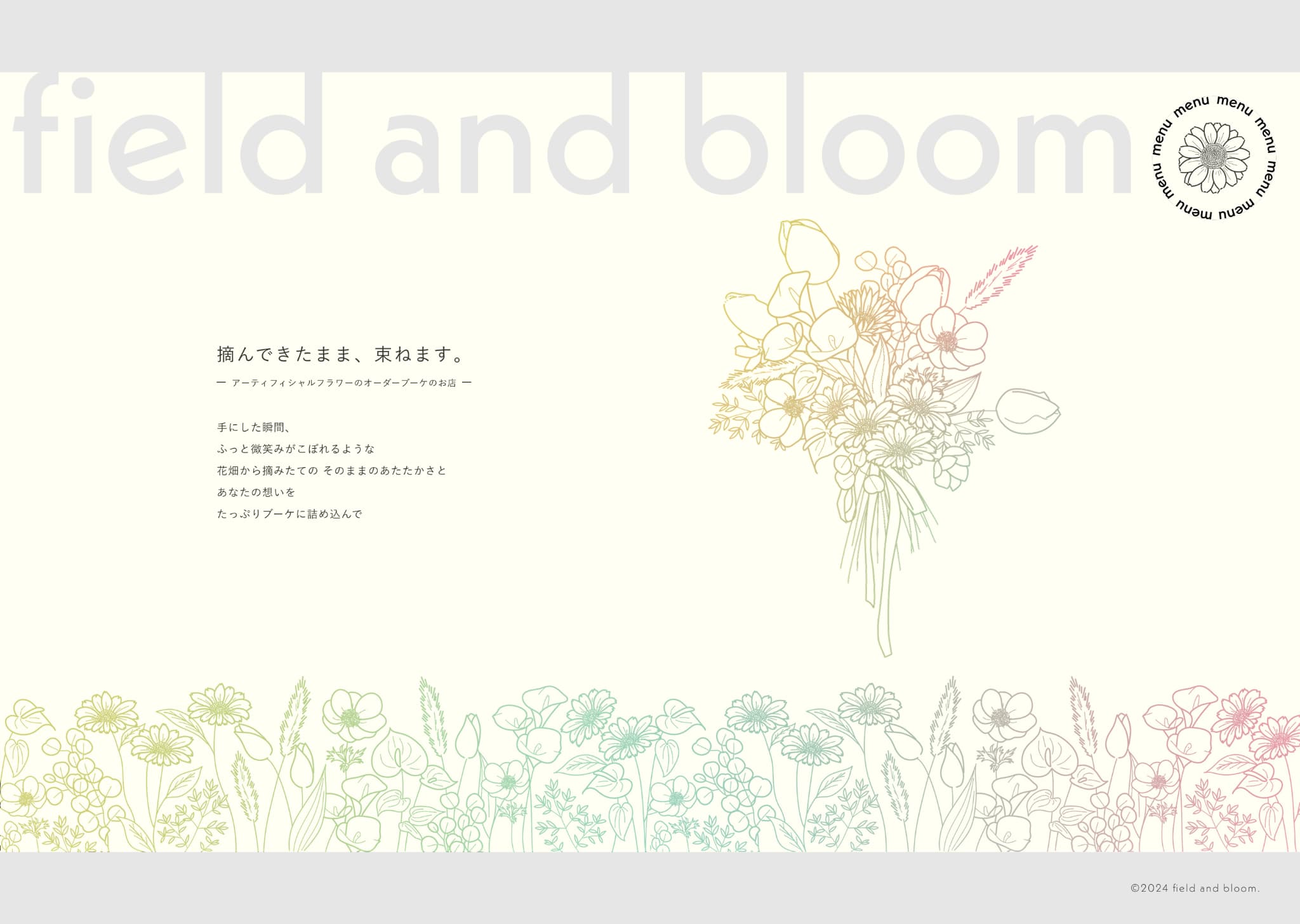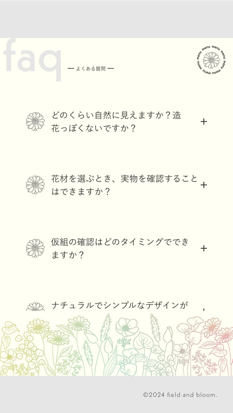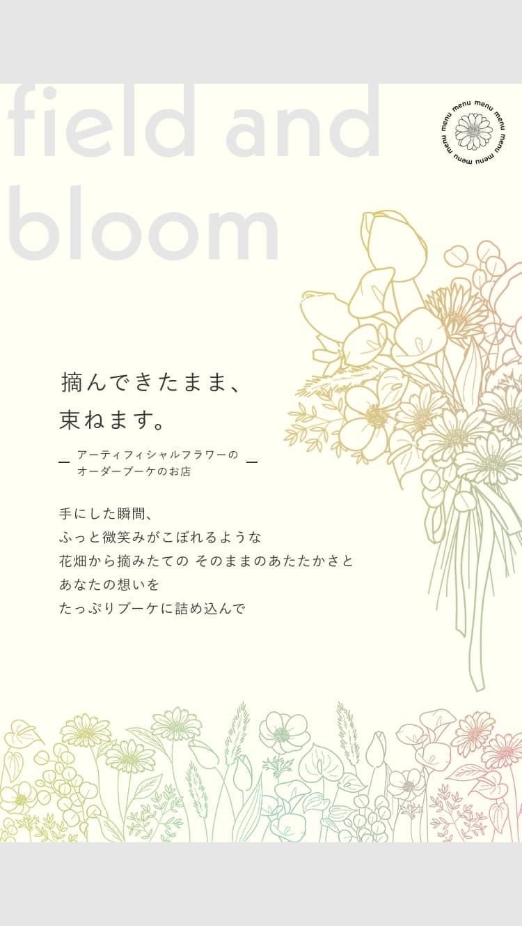 また、花畑を連想させるために、画面下部やナビゲーションメニュー背景などサイトの至る所にたくさんの花のイラストを使用しました。花・ブーケのイラストをグラデーションにしたアクセントカラーにすることにより、『花畑から摘み取った様々な種類の花を色々なブーケにしていく』ことをイメージし、全てのイラストを繊細な線画にすることで主張を抑えながら、丁寧さとそっと寄り添うようなあたたかみを表現しました。
