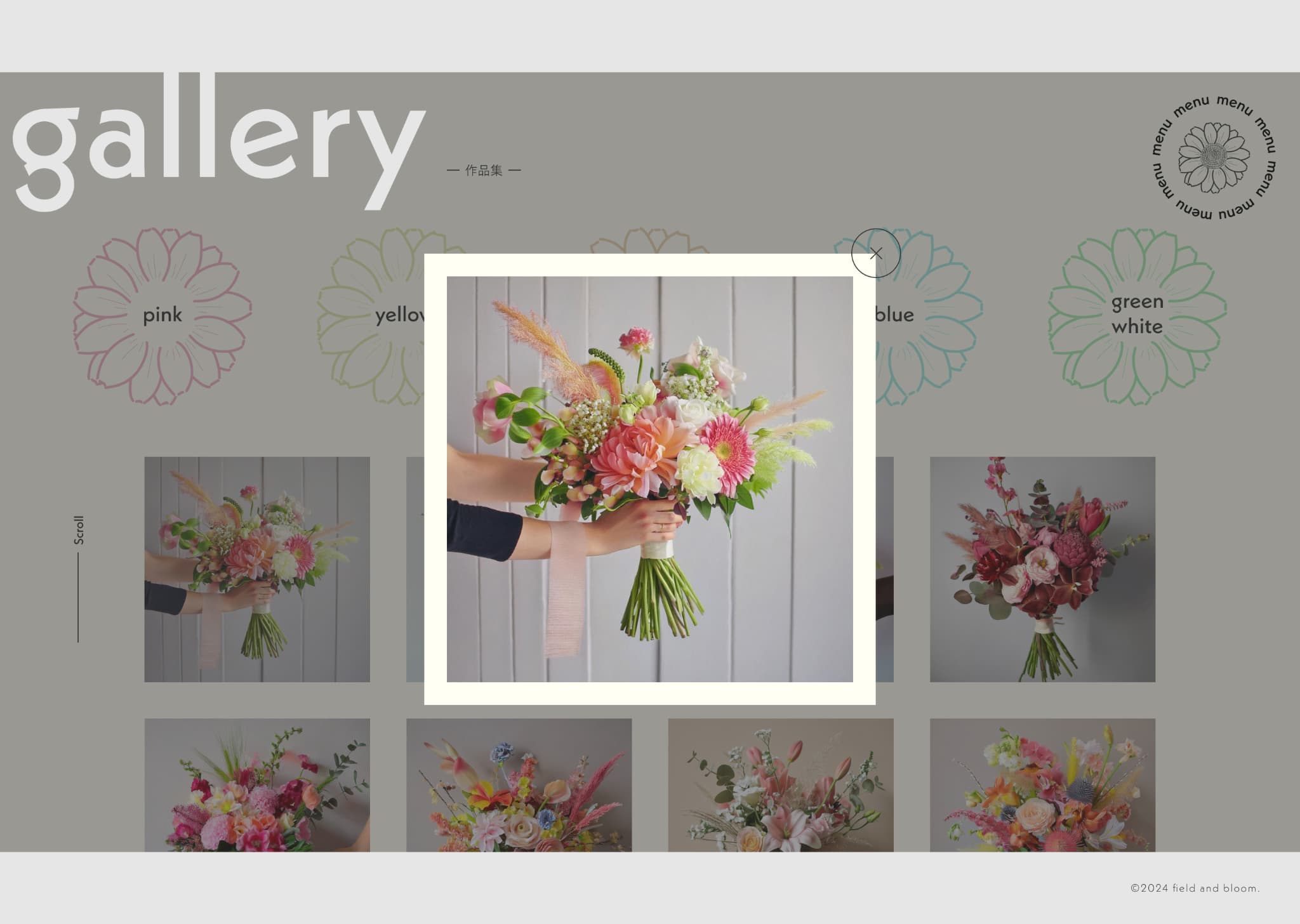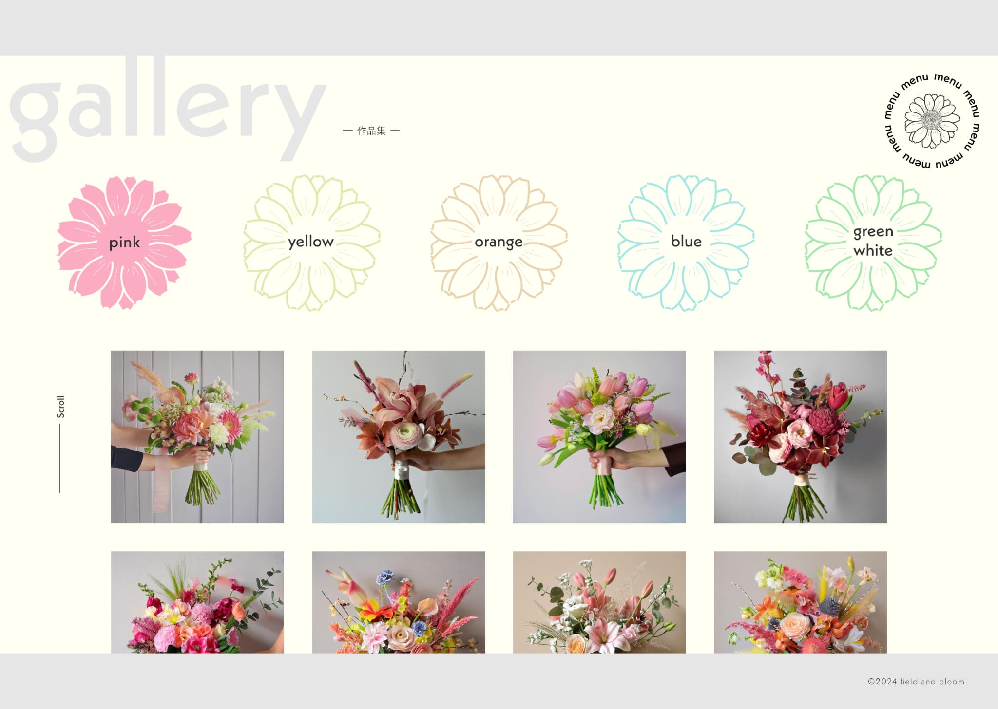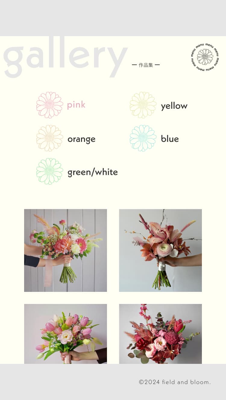galleryページについては、載せる作品をブーケの色ごとに分けて絞り込めるようにすることで、探しやすく見やすい構成にしました。