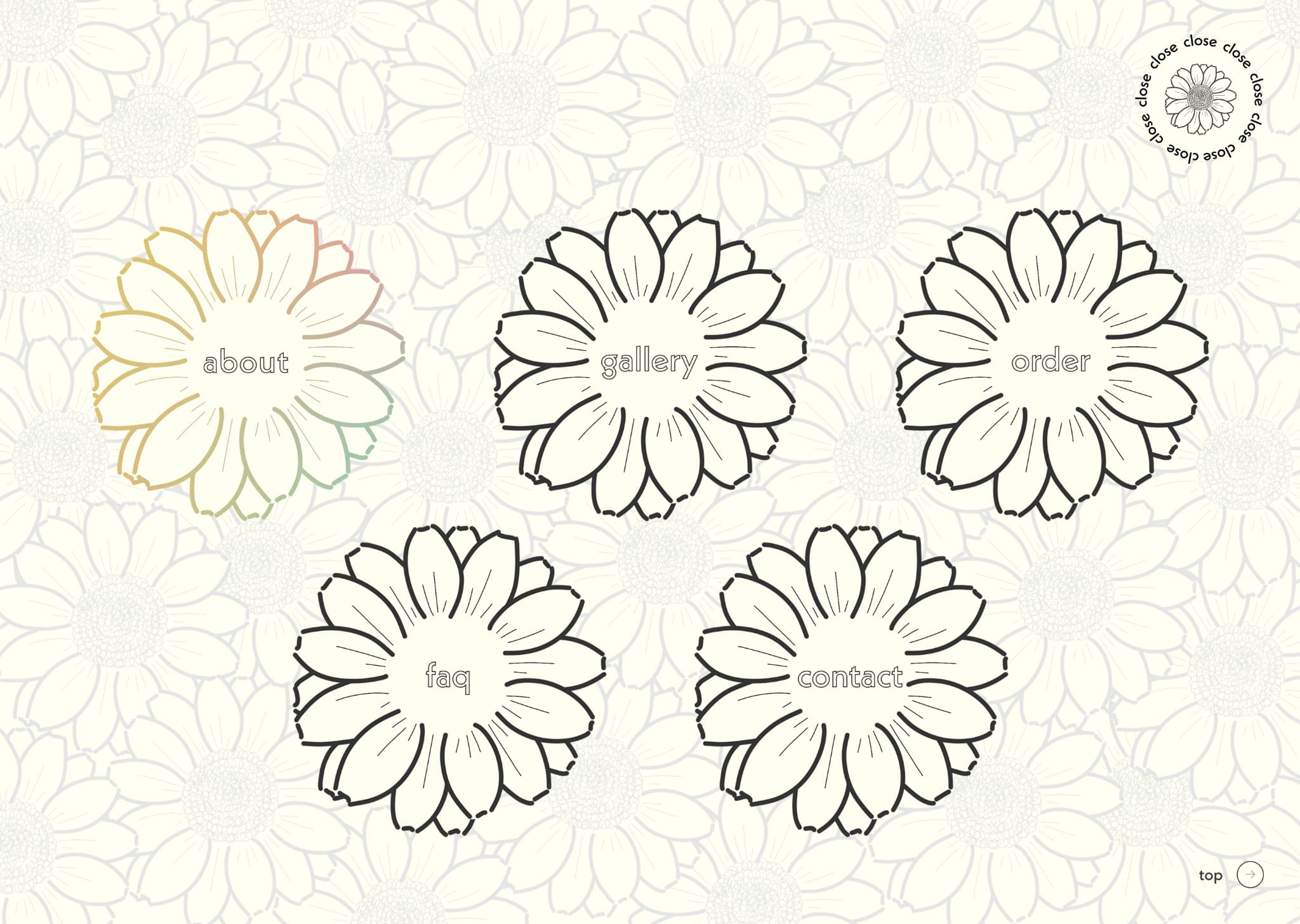 メインカラーは黄みのあるホワイトと淡いグレー、アクセントカラーはgalleryページで分けた5色を選び、全て淡いトーンに合わせることで統一感を持たせつつ、ブーケ写真を邪魔せず映えるようシンプルにまとめました。