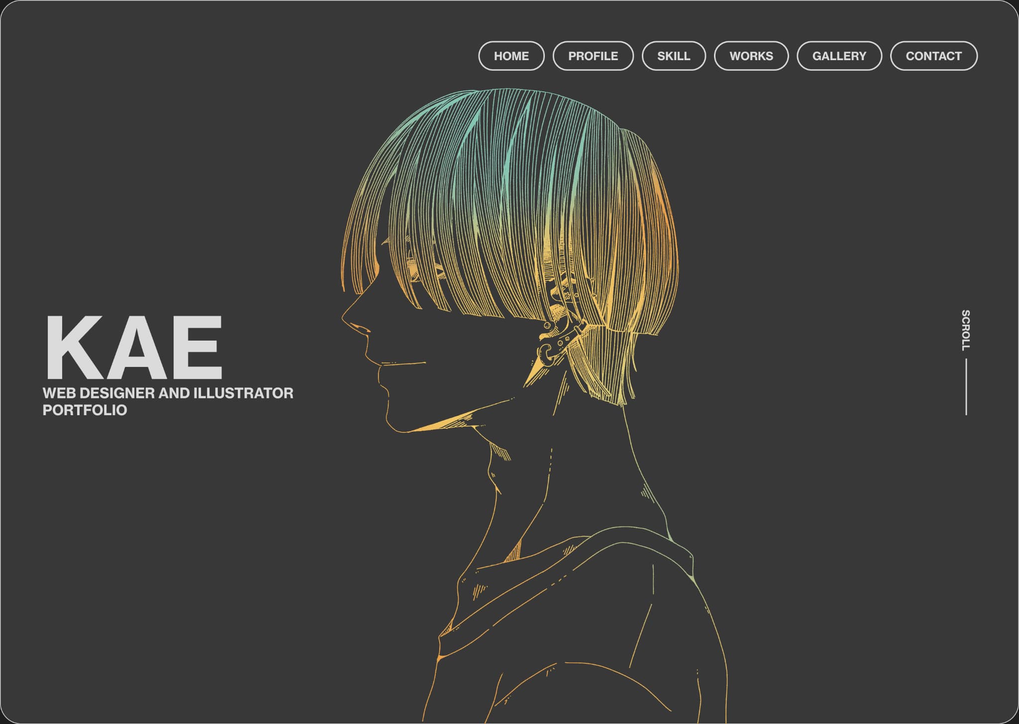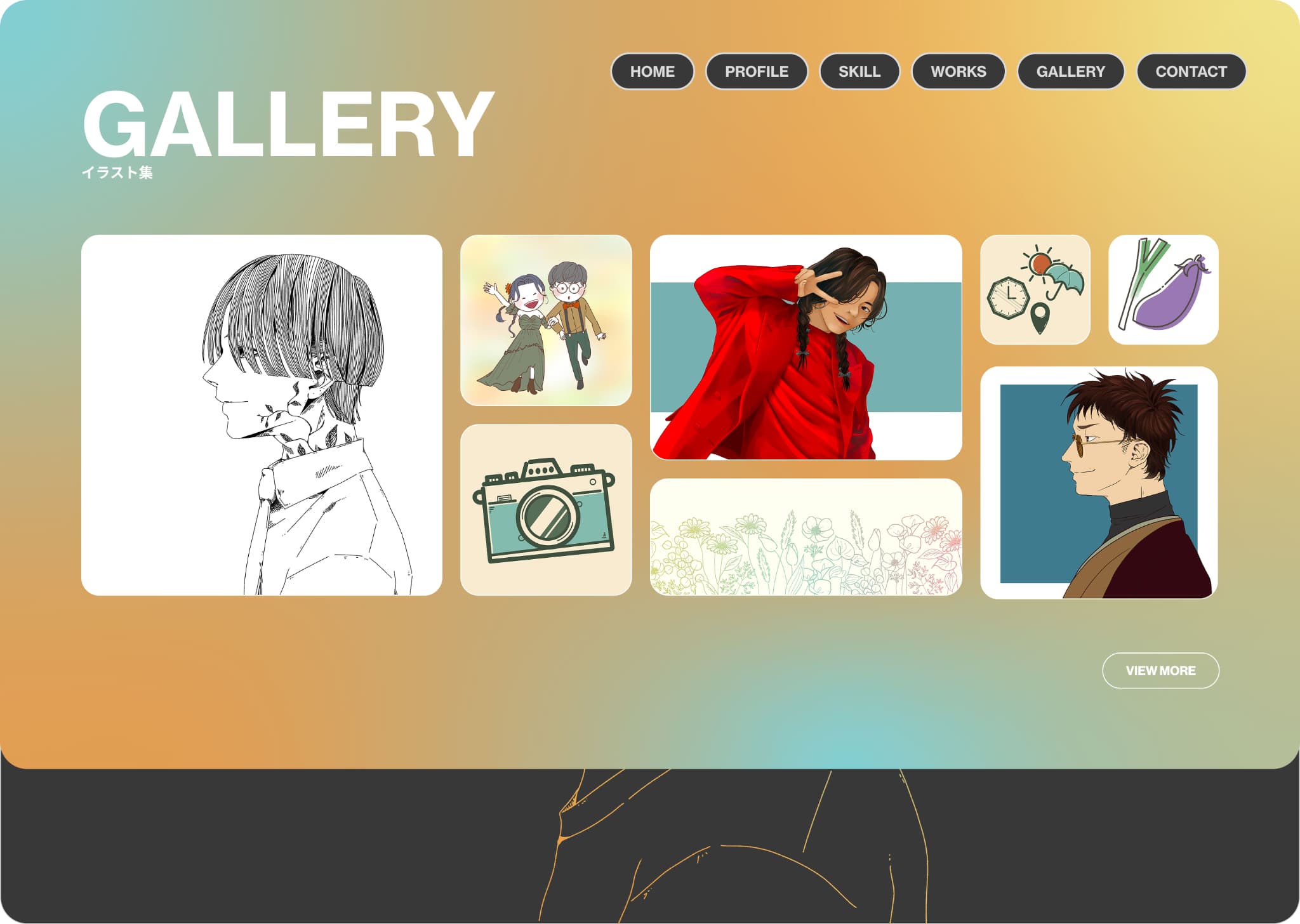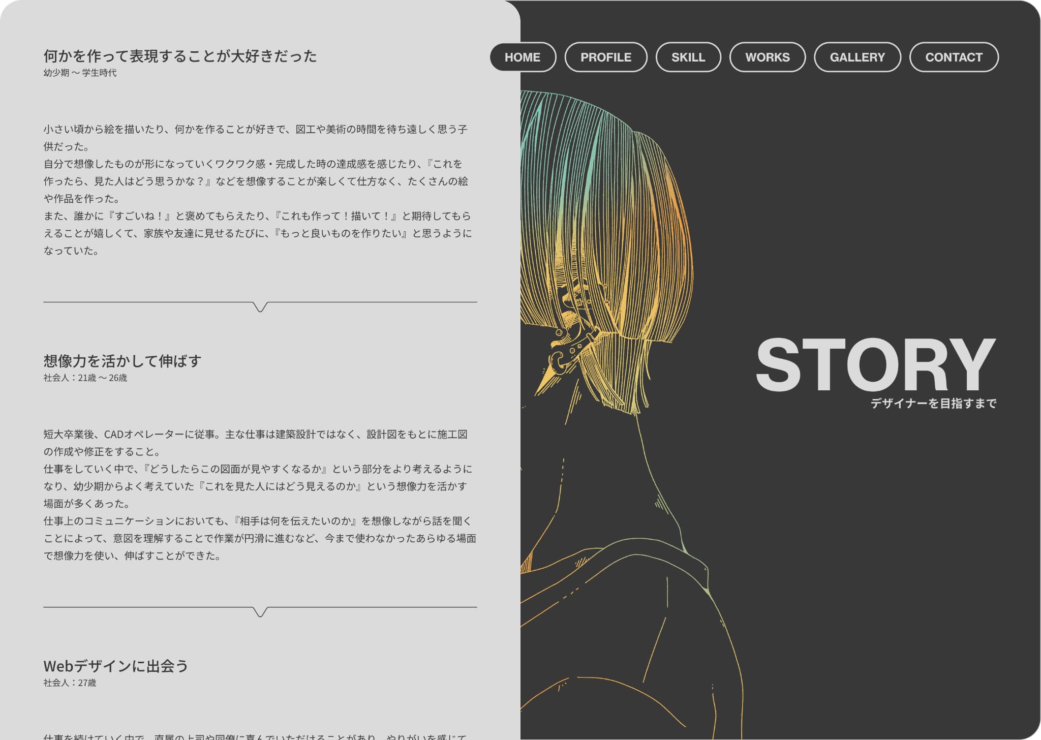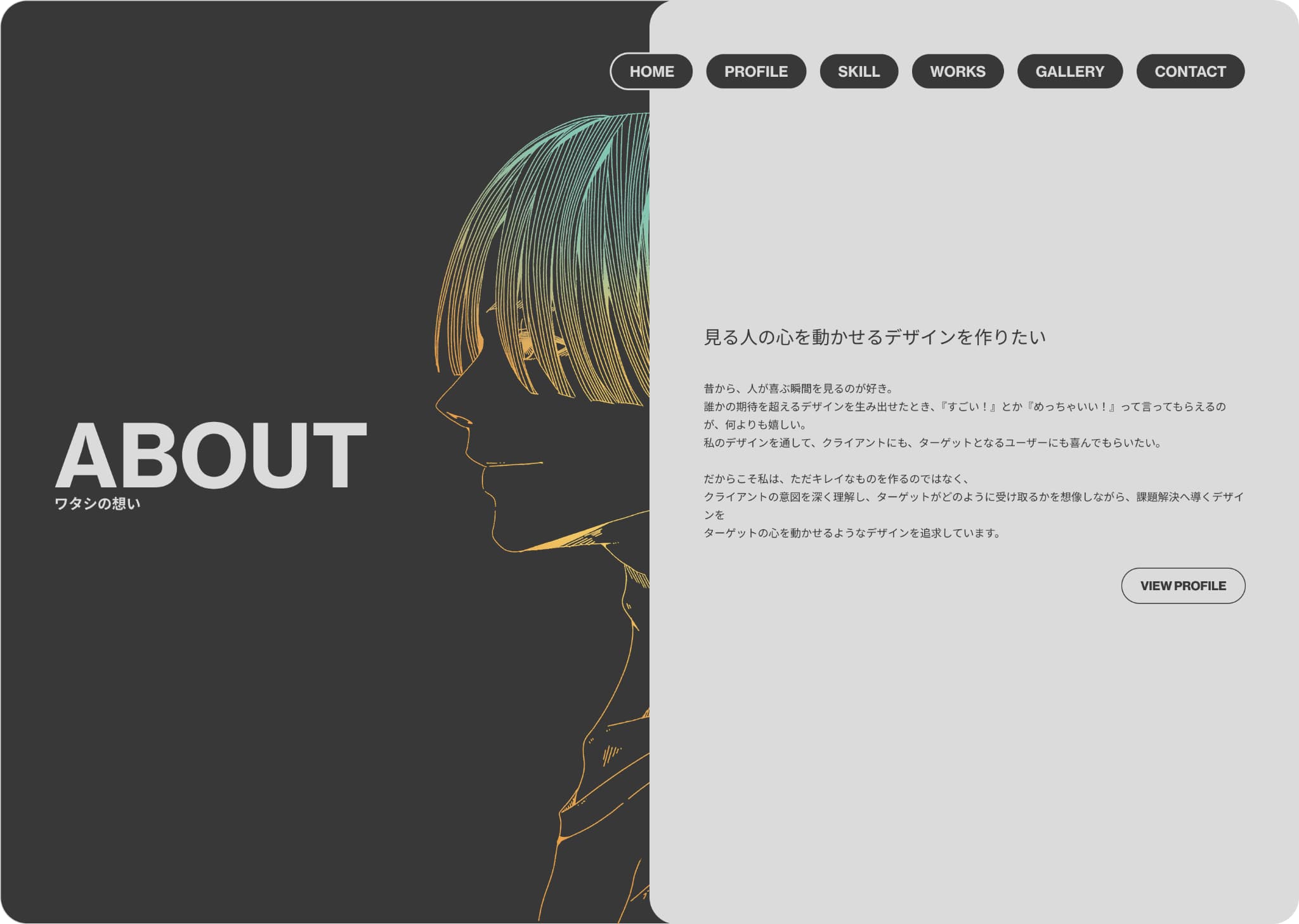 メインカラーを無彩色でまとめ、アクセントカラーをグラデーションにしたことによって、無彩色だけのシンプルなサイトに個性を出し、アクセントカラーを使ったメインイラストやギャラリー、カラーのついた制作物に目が向くようデザインしました。