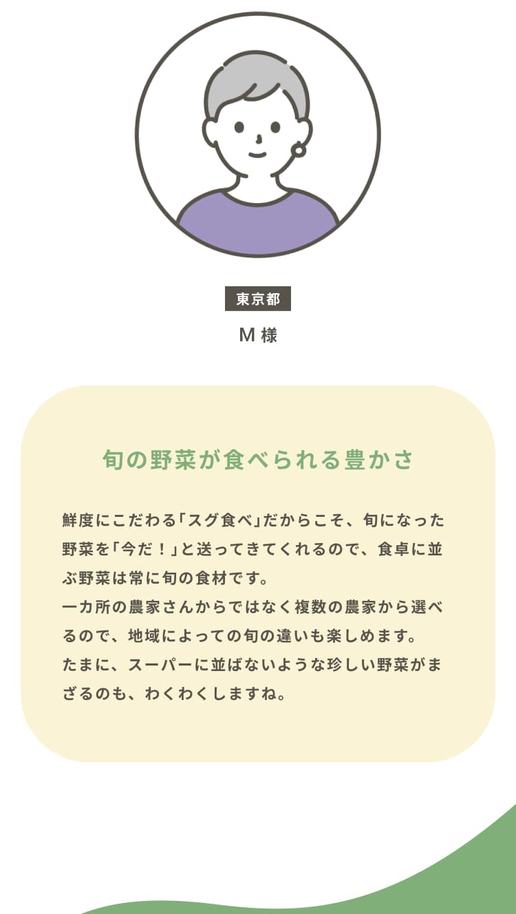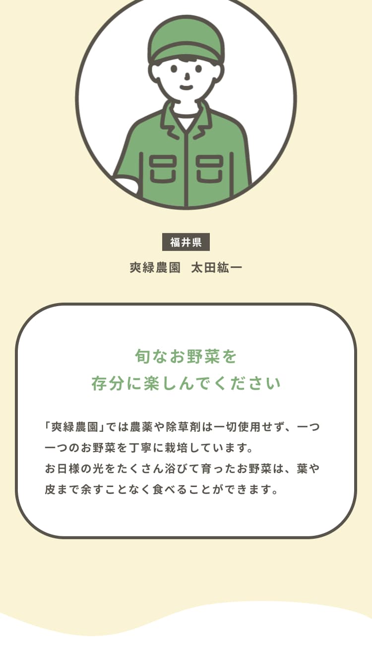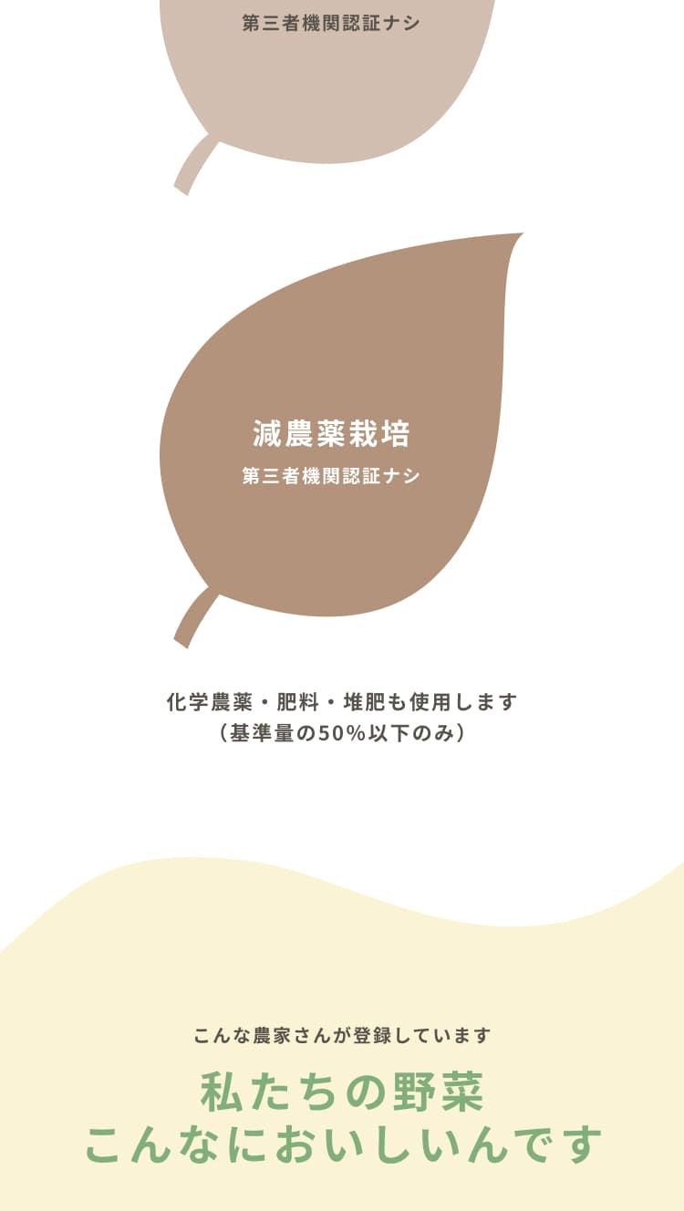 “農家が大切に育てた安心できる野菜”をイメージできるよう、人の手が野菜と写っている写真やイラストで安心感や信頼感、サービスの丁寧さを感じるものを選びました。カラーはあたたかみのあるベージュをメインに、自然を連想させるグリーンでまとめ、テキストなどはブラックを使わずブラウンにすることや、曲線の装飾、トマトやナスのイラストで柔らかさや安心感を表現しました。