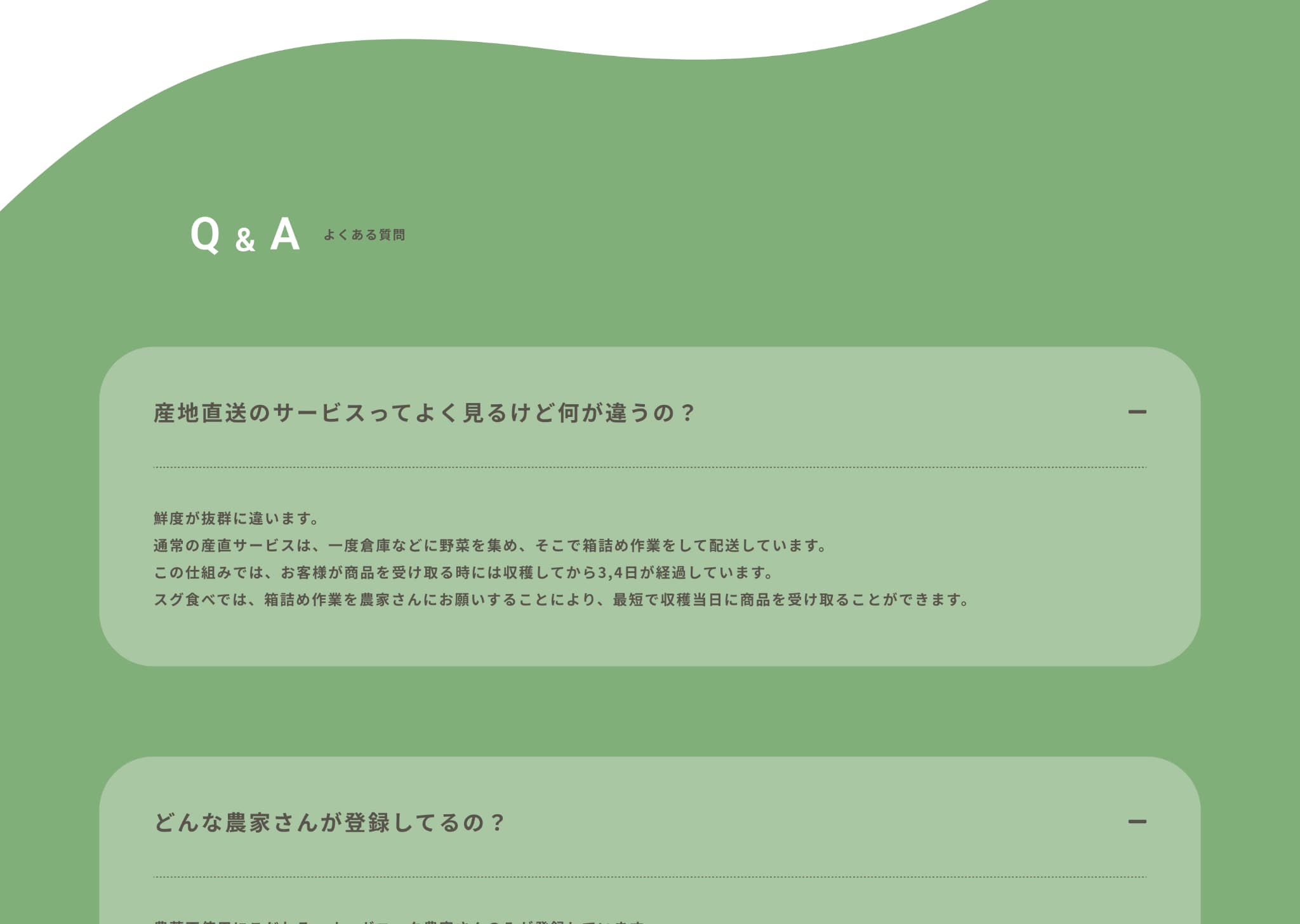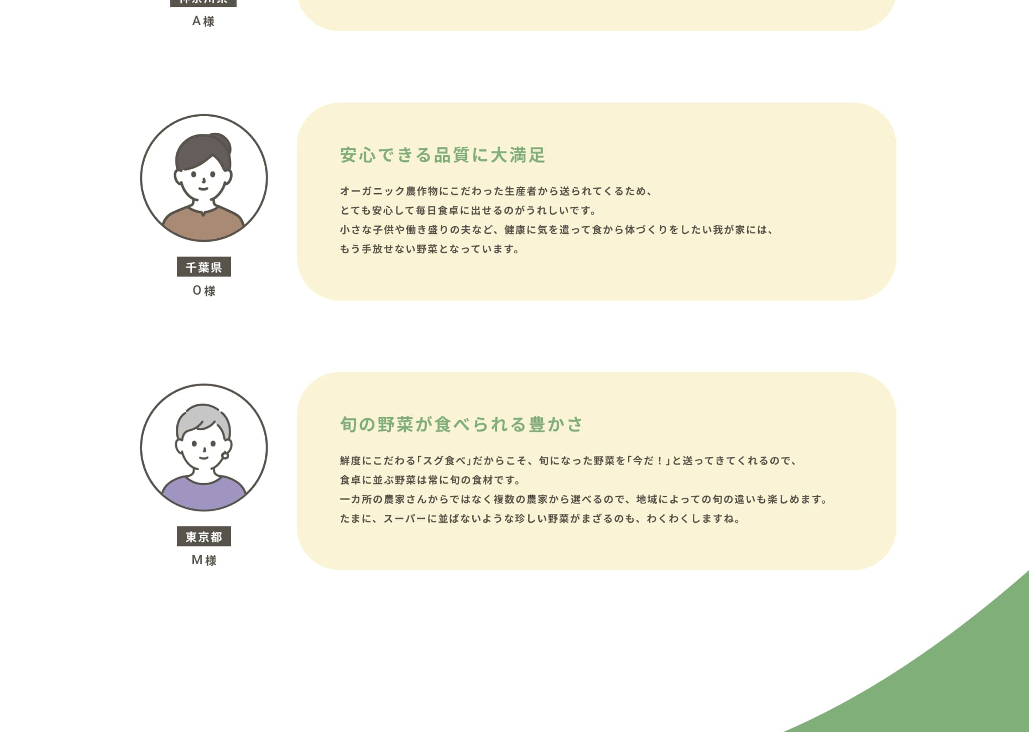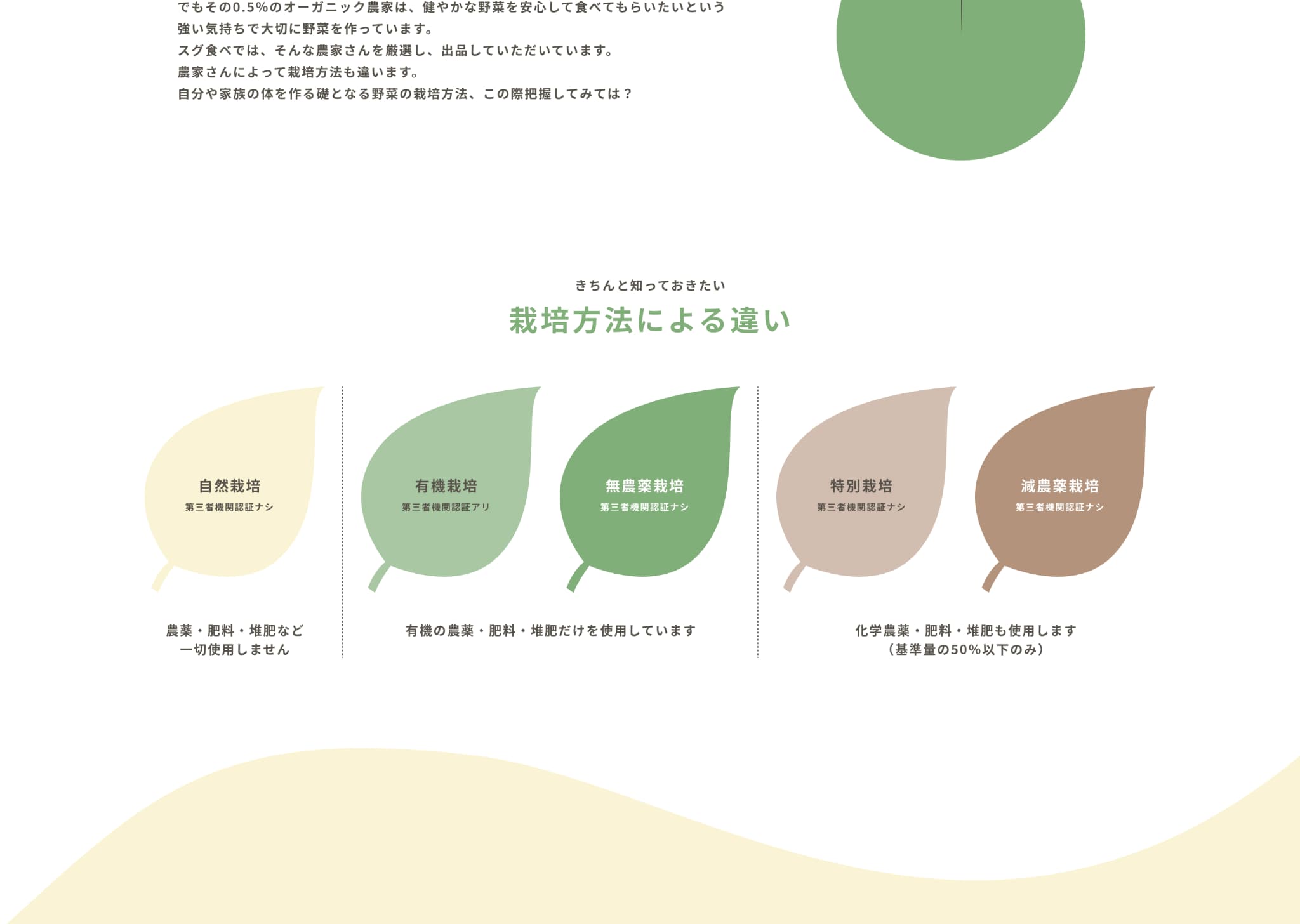 “農家が大切に育てた安心できる野菜”をイメージできるよう、人の手が野菜と写っている写真やイラストで安心感や信頼感、サービスの丁寧さを感じるものを選びました。カラーはあたたかみのあるベージュをメインに、自然を連想させるグリーンでまとめ、テキストなどはブラックを使わずブラウンにすることや、曲線の装飾、トマトやナスのイラストで柔らかさや安心感を表現しました。