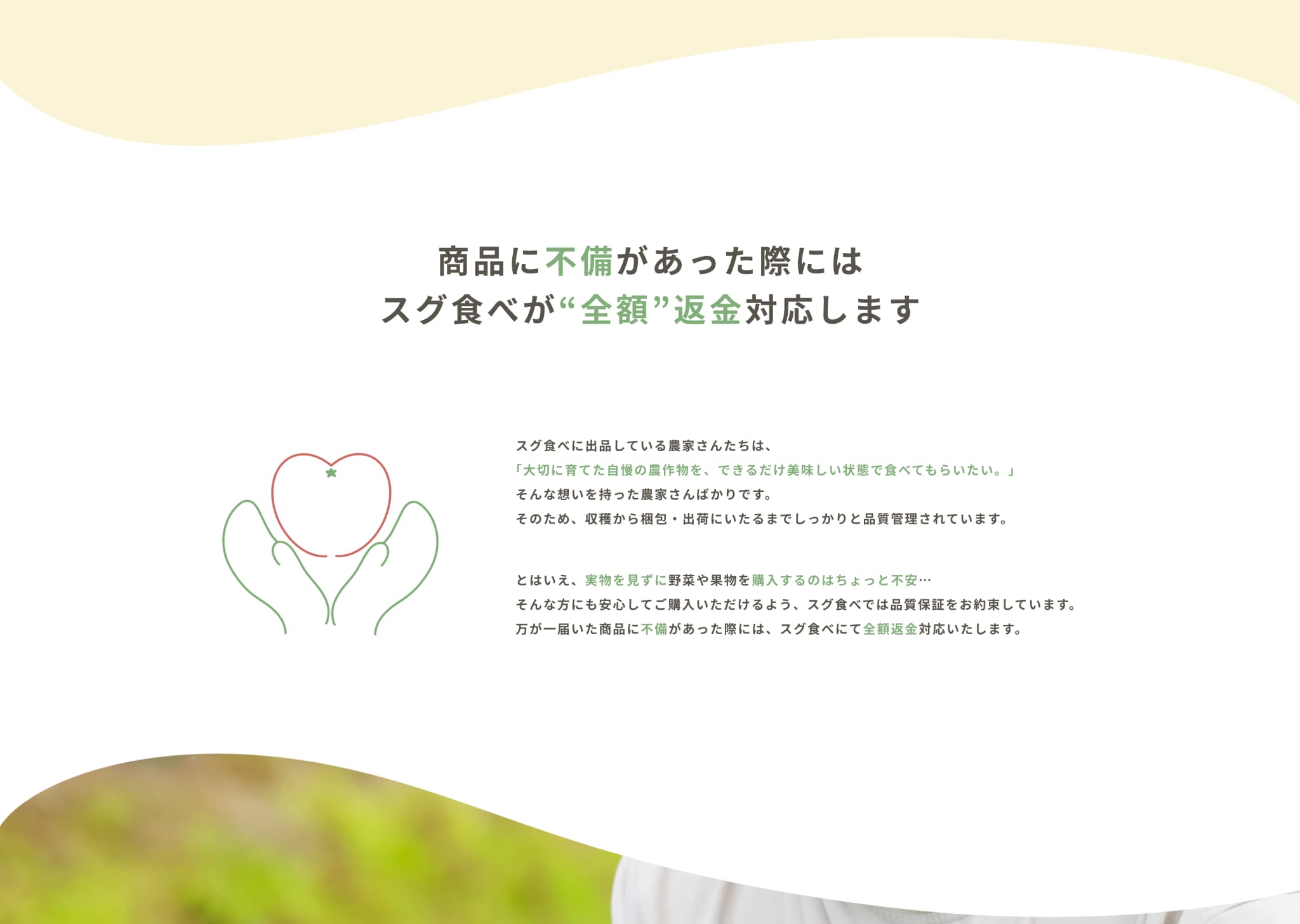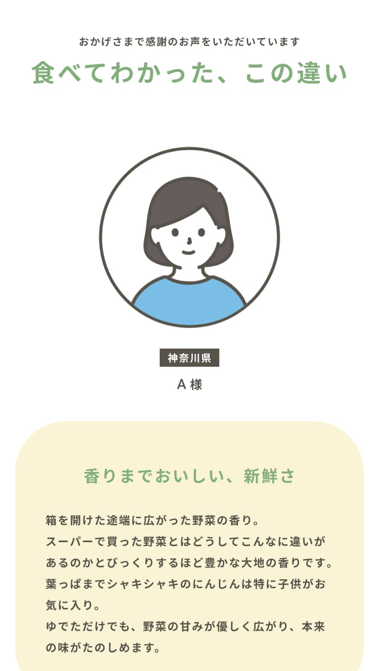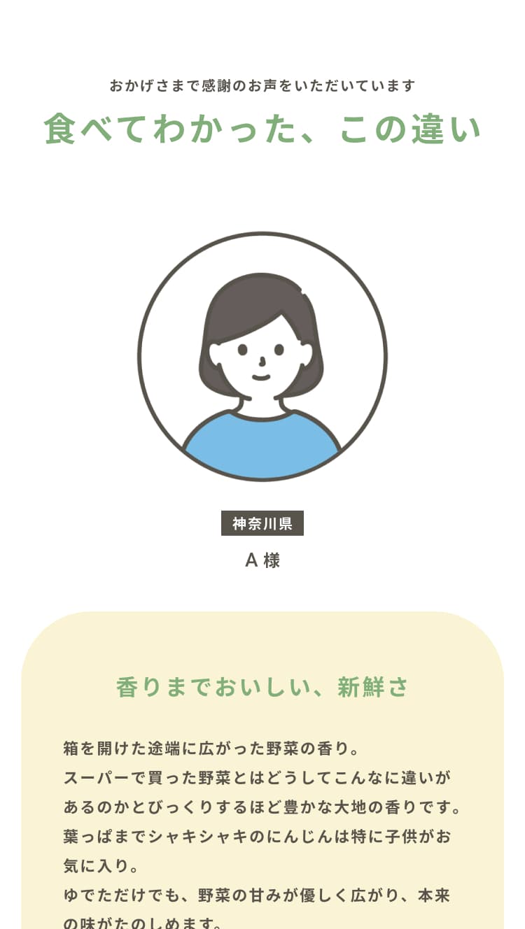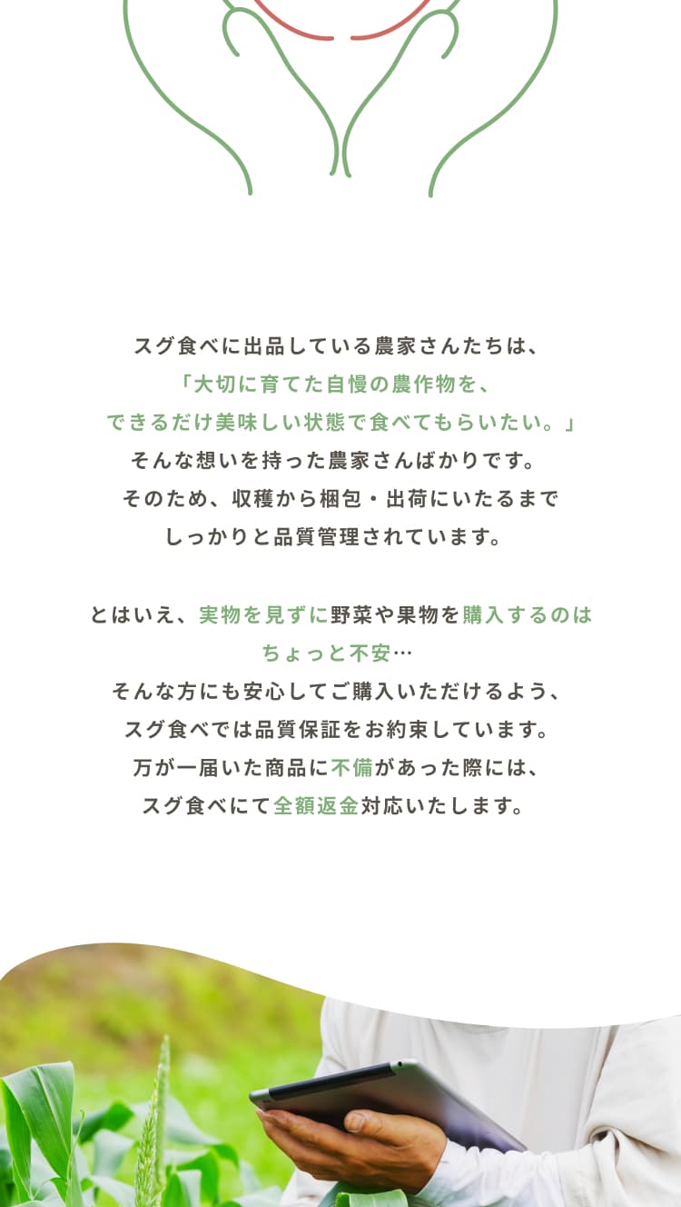 内容にあった写真・イラストを使用するのはもちろん、『農家が大切に育てた安心できる野菜』をイメージできるよう、収穫した野菜を持った人の写真や、野菜を検査する人の写真、返金保証項目のハートを模したトマトを手で包んでいるイラストなど、人の手が野菜と写っている写真やイラストで安心感や信頼感、サービスの丁寧さを感じるものを選びました。