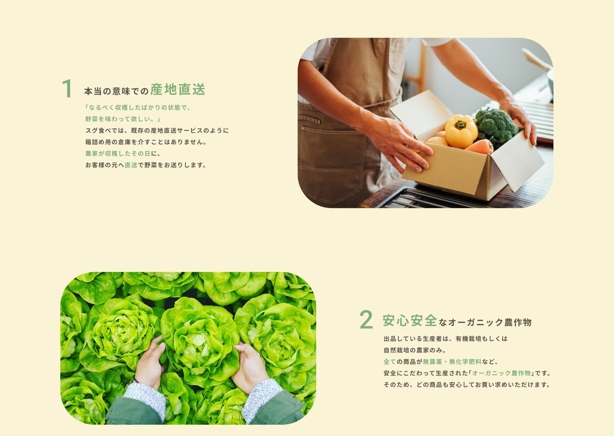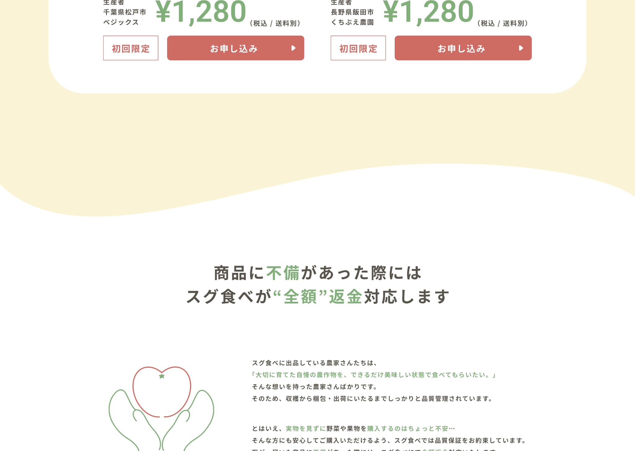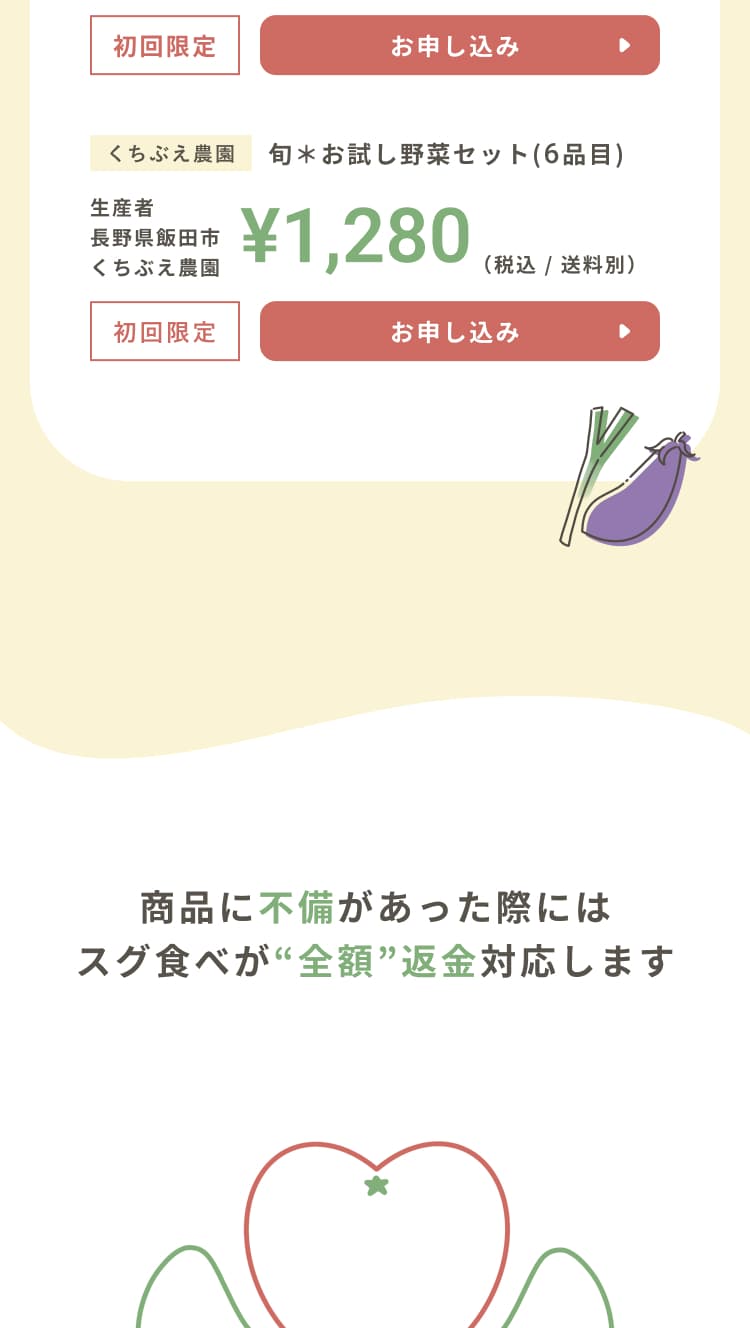 内容にあった写真・イラストを使用するのはもちろん、『農家が大切に育てた安心できる野菜』をイメージできるよう、収穫した野菜を持った人の写真や、野菜を検査する人の写真、返金保証項目のハートを模したトマトを手で包んでいるイラストなど、人の手が野菜と写っている写真やイラストで安心感や信頼感、サービスの丁寧さを感じるものを選びました。